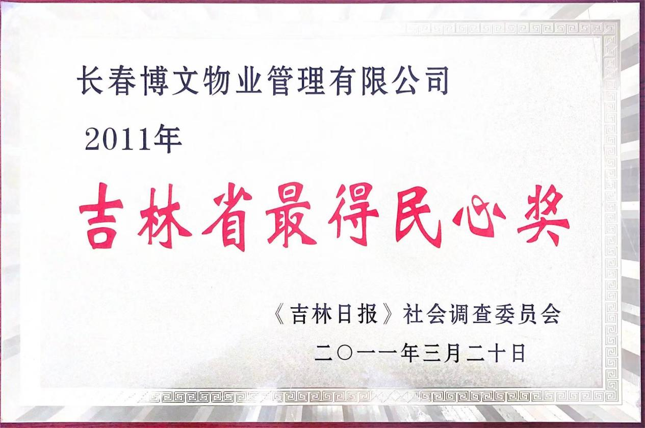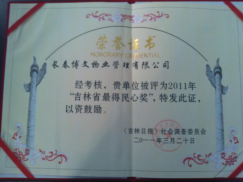 2011年榮獲“吉林省最得民心獎(jiǎng)”證書(shū)