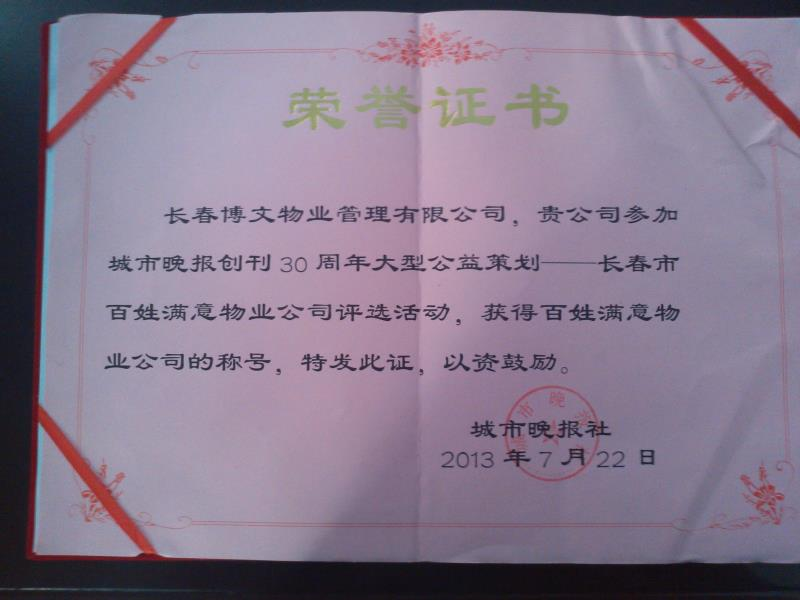 2013年榮獲“百姓滿意物業(yè)公司”稱(chēng)號(hào)